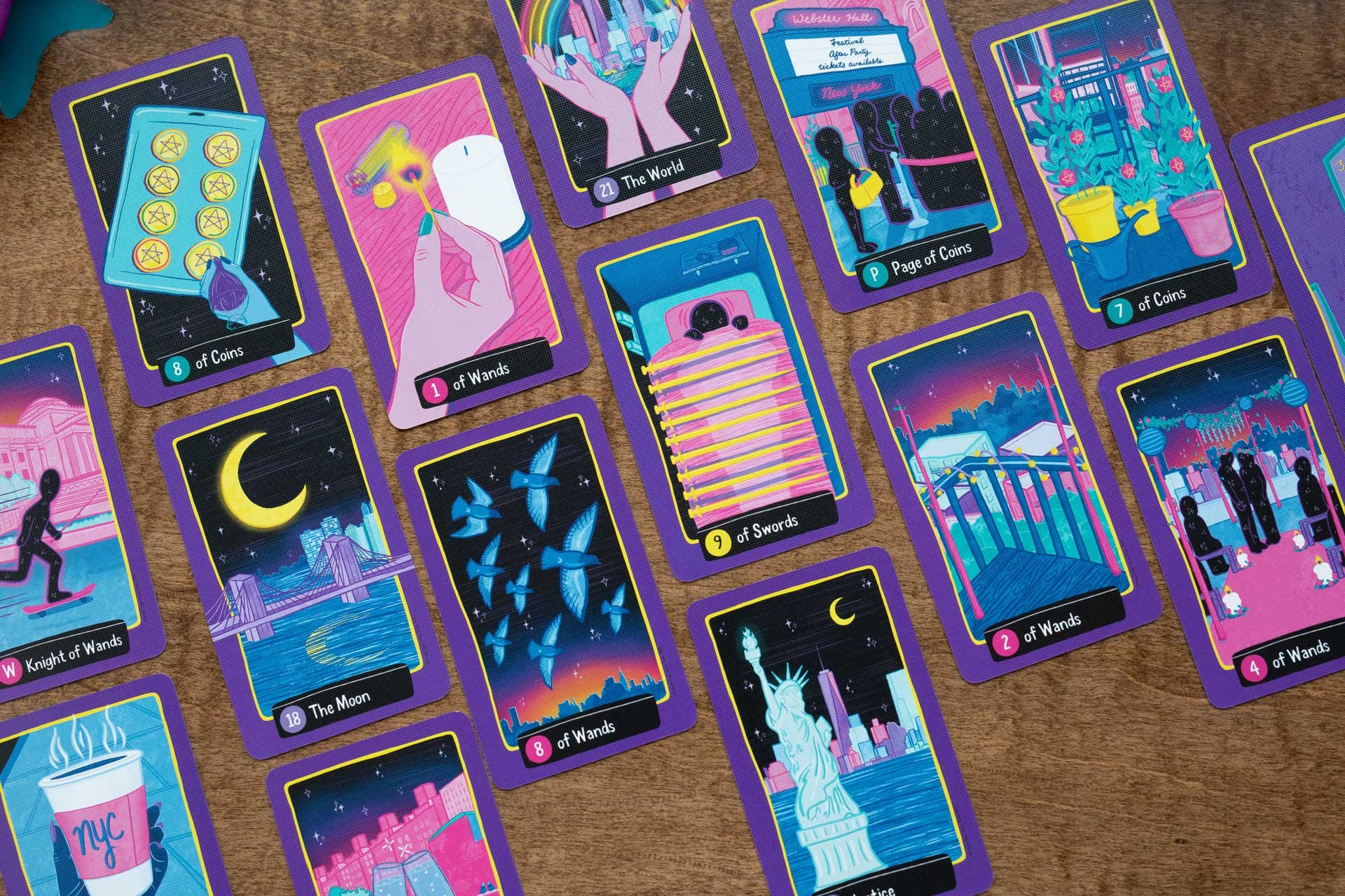 78 illustrated cards that tell the story of the hero’s journey, set against electric the New York City skyline.